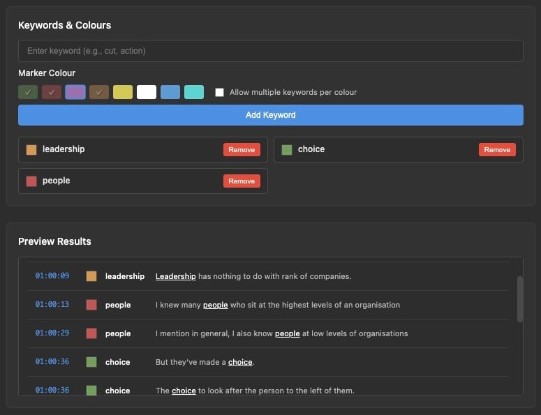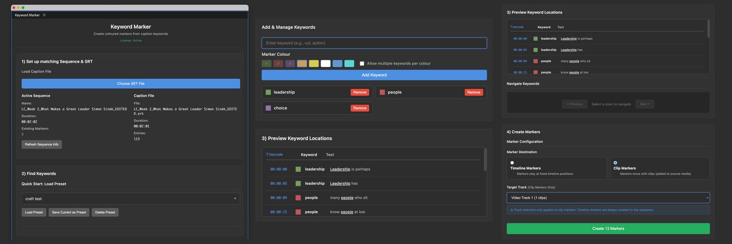 Keyword Marker automatically places visual markers on your Premiere Pro timeline exactly where keywords appear.